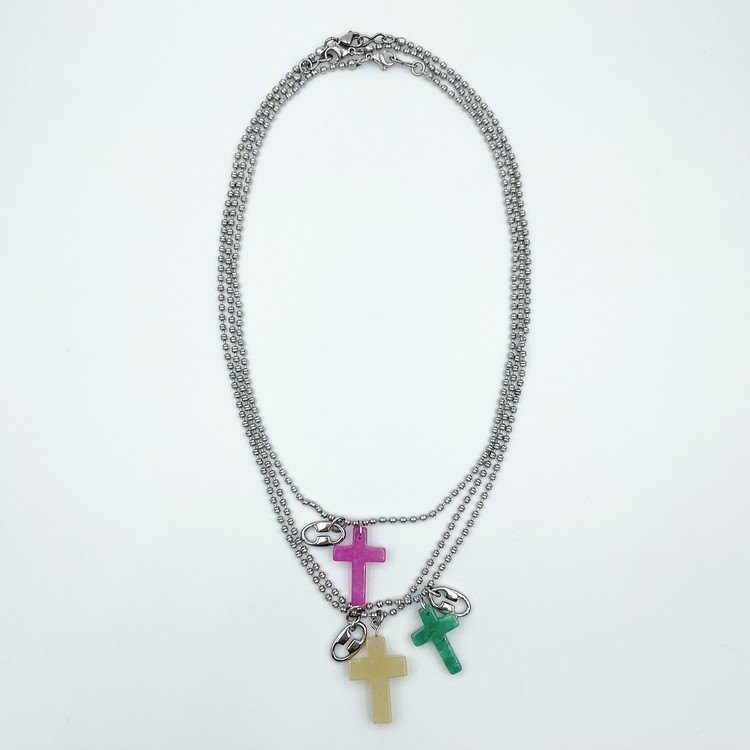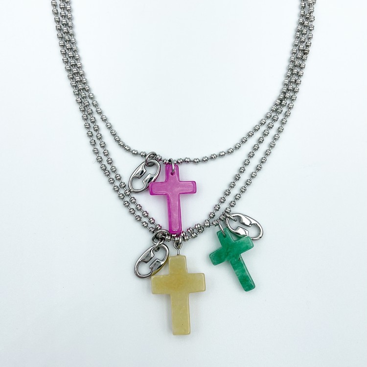 빈티지 무드의 스톤 크로스 펜던트와 옌드의 로고 펜던트가 레이어링 되어