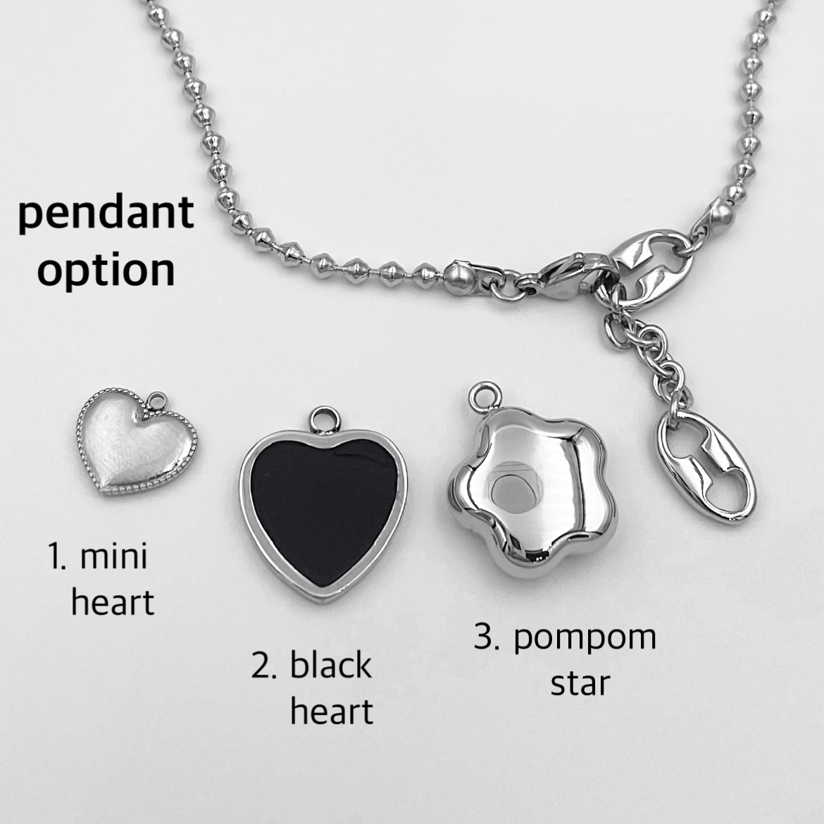 * 펜던트 스타일 옵션: mini heart, black heart, pompom star (3가지 중 선택)