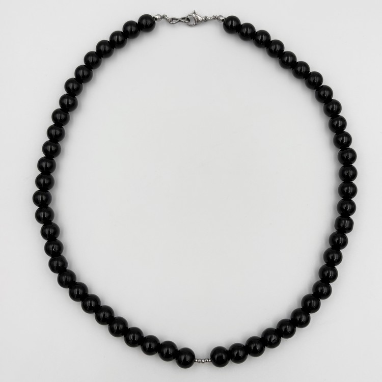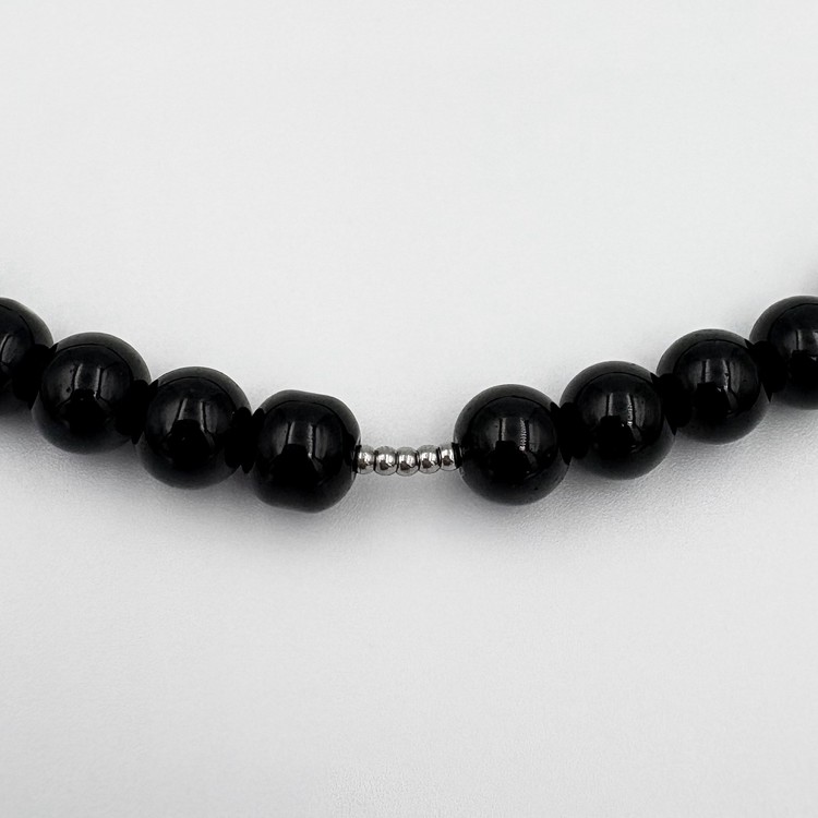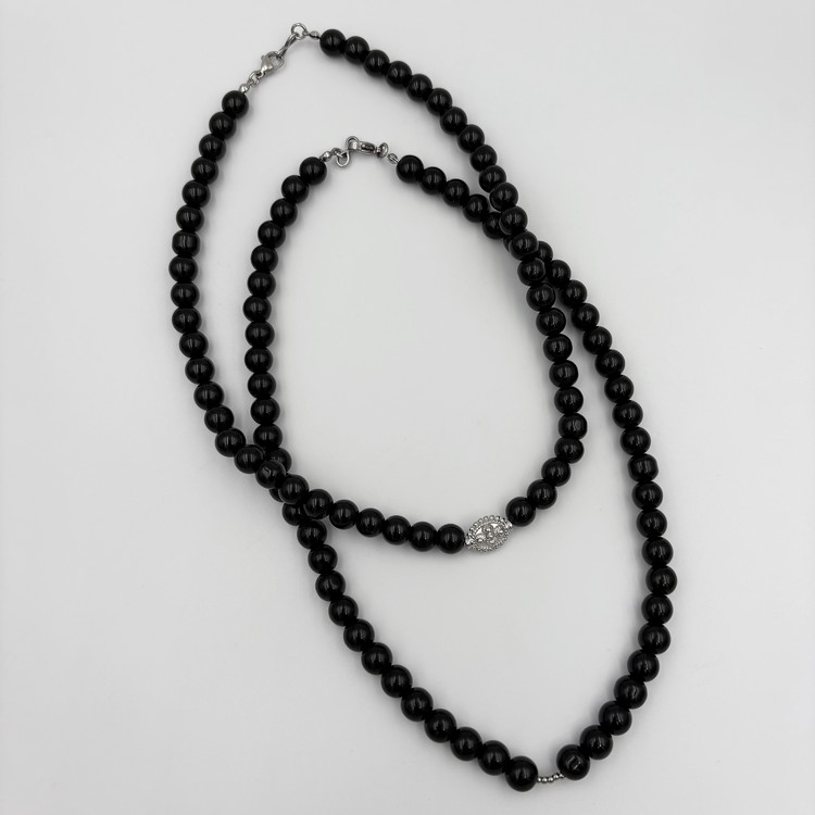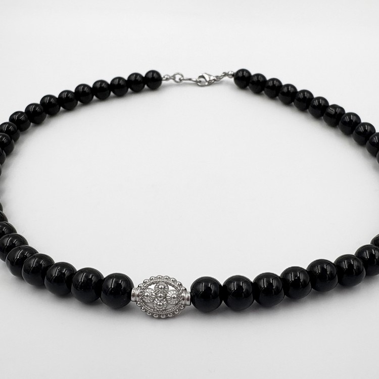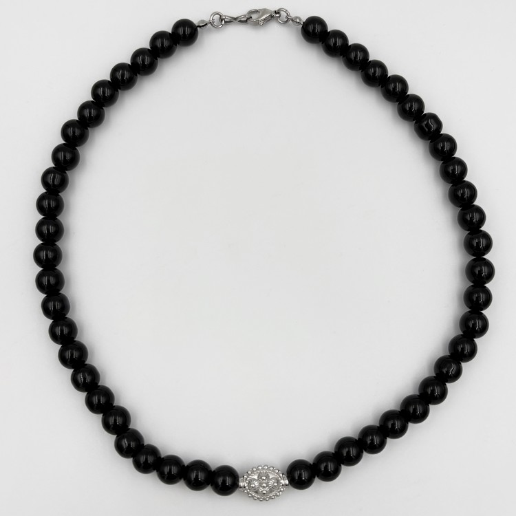 엔틱한 써지컬 참 장식의 오닉스 비즈 목걸이.