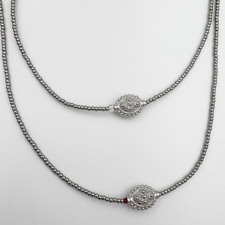메인 펜던트 바로 옆 자리, 하나의 컬러 비즈(클리어 화이트/레드)를 선택 할 수 있는 비즈 목걸이입니다.